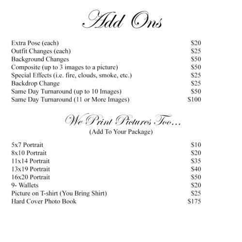 Sessions are in studio and/or on location. An additional fee may be required for on location photoshoots, please contact us before booking at 251-452-5200.